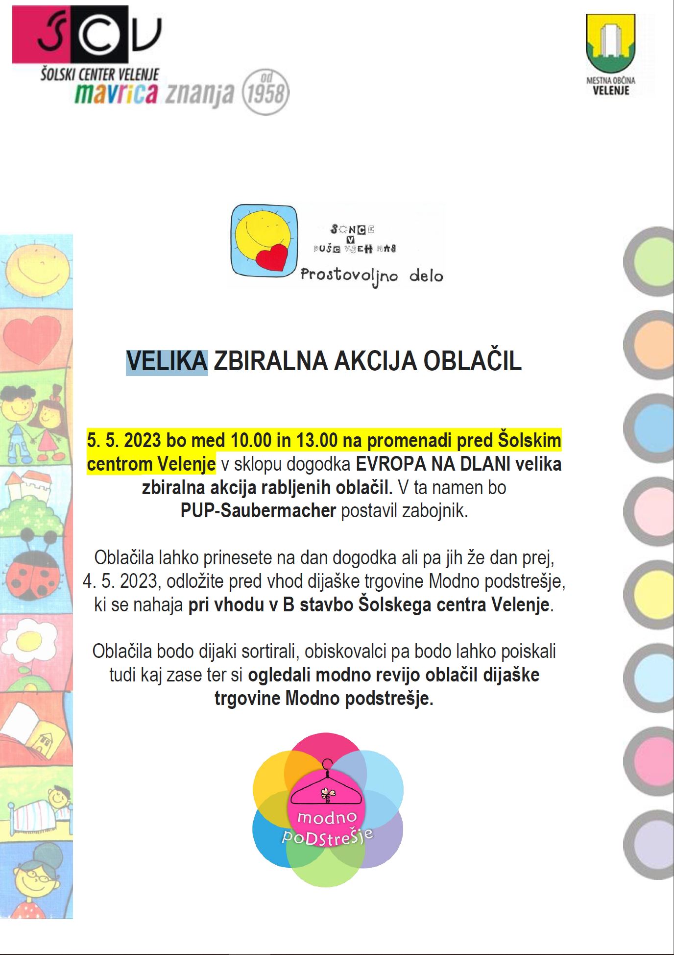 5. 5. 2023 bo med 10.00 in 13.00 na promenadi pred Šolskim centrom Velenje v sklopu dogodka EVROPA NA DLANI velika zbiralna akcija rabljenih oblačil. V ta namen bo PUP-Saubermacher postavil zabojnik. Brošura
